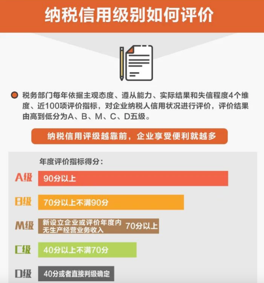 税务部门每年依据主观态度、遵从能力、实际结果和失信程度4个维度、近100项评价指标,对企业纳税人信用状况进行评价,评价结果由高到低分为A、B、M、C、D五级,详细的分级对应可以看下图。