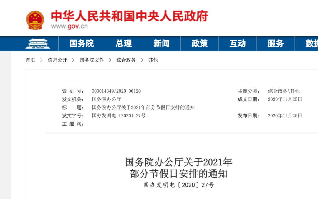 一到年底,不少职场人最关心的事情就是什么时候回家过年。这不,国务院办公厅发布了关于2021年部分节假日安排的通知。