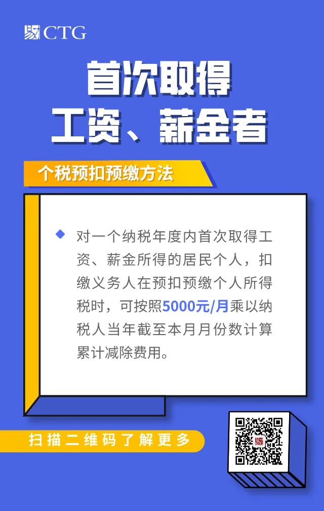 《公告》中指出,对一个纳税年度内首次取得工资、薪金所得的居民个人,扣缴义务人在预扣预缴工资、薪金所得个人所得税时,可扣除从年初开始计算的累计减除费用(5000元/月)。