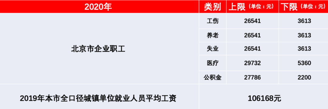 核定2020年度职工基本养老保险、失业保险和工伤保险缴费基数上下限依据:2019年本市全口径城镇单位就业人员平均工资106168元。