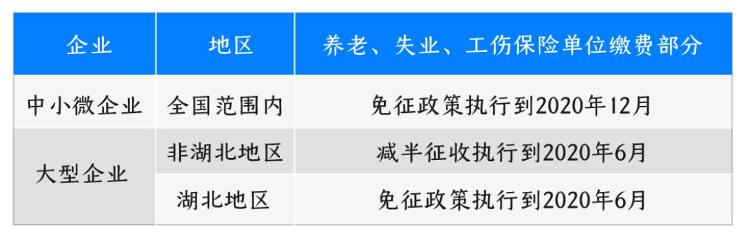 一、各省、自治区、直辖市及新疆生产建设兵团(以下统称省)对中小微企业三项社会保险单位缴费部分免征的政策,延长执行到2020年12月底。各省(除湖北省外)对大型企业等其他参保单位(不含机关事业单位,下同)三项社会保险单位缴费部分减半征收的政策,廷长执行到2020年6月底。湖北省对大型企业等其他参保单位三项社会保险单位缴费部分免征的政策,继续执行到2020年6月底。