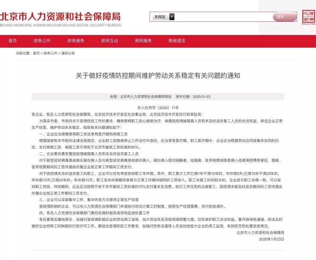 为落实北京市委、北京市政府关于疫情防控工作的要求,确保被传染职工安心接受治疗,被隔离人员和未及时返京复工人员安心检查休息,1月23日,北京市人力资源和社会保障局发布《关于做好疫情防控期间维护劳动关系稳定有关问题的通知》,明确了医疗期工资、隔离期工资、返京复工假期等相关待遇,要求职工和企业安心配合防控疫情。