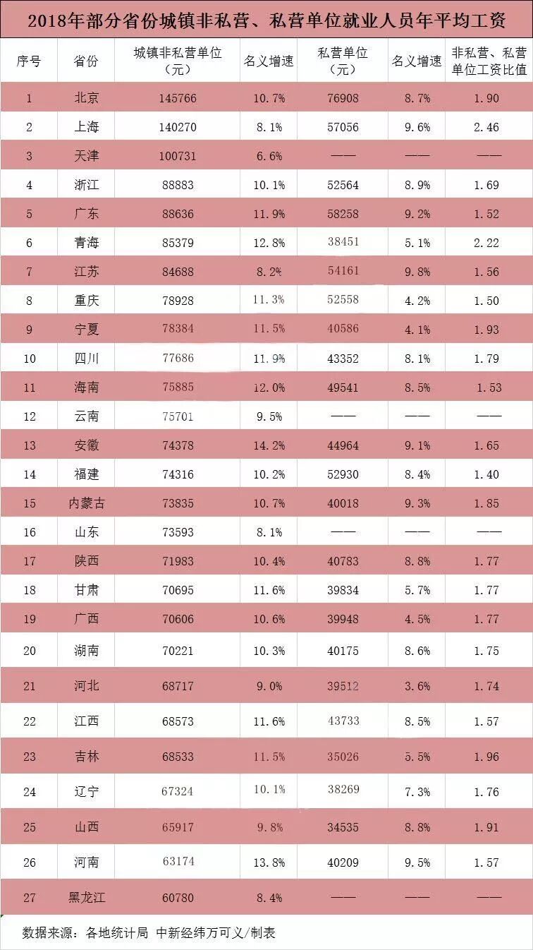 上述已公布平均工资的地区中,其非私营单位就业人员的年平均工资都明显高于私营单位。以上海为例,2018年上海市城镇非私营单位就业人员年平均工资为140270元,私营单位就业人员年平均工资为57056元,前者是后者的2.46倍,差距为全国最大;此外青海省非私营单位平均年工资也是当地私营单位的2.22倍。
