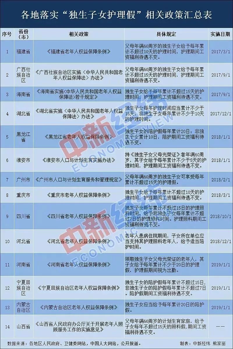 据中新经纬客户端不完全统计,截至2019年3月22日,已至少有福建、广西、海南、湖北、黑龙江、重庆、四川、河北、河南、宁夏、内蒙古、山西等12省份,以及淮安、广州等2市出台了与“独生子女护理假”相关的具体规定。
