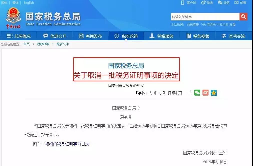 为贯彻落实党中央、国务院关于减税降费和减证便民决策部署,税务总局决定再取消12项(附件所列1?12项)税务证明事项,自公布之日起施行。所涉及的规章、规范性文件,按程序修改后另行公布。