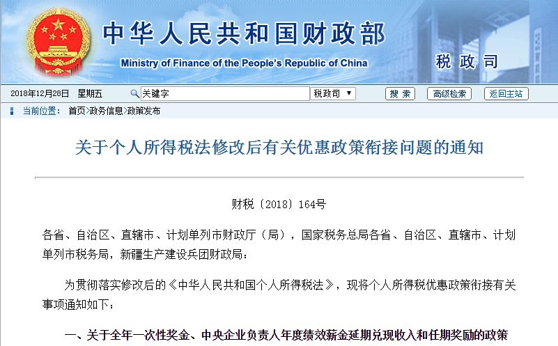关于全年一次性奖金、中央企业负责人年度绩效薪金延期兑现收入和任期奖励的政策