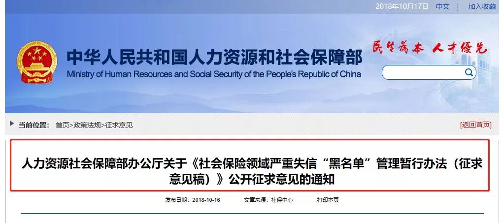 人社部日前制定了《社会保险领域严重失信“黑名单”管理暂行办法(征求意见稿)》,向社会公开征求意见,意见反馈截止时间为10月29日。根据征求意见稿第5条规定,“五险一金”迎来一个大变化??将会建立"黑名单"制度。