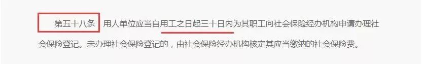 《社会保险法》第五十八条:用人单位应当自用工之日起三十日内为其职工向社会保险经办机构申请办理社会保险登记。