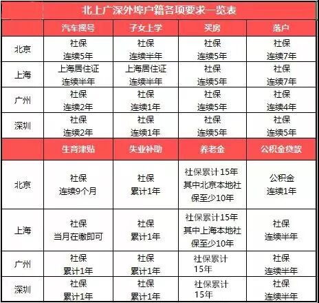 下面我们先通过一张图表来直观对比一下北上广深的常见生活事项对社保、公积金、居住证的年限要求。