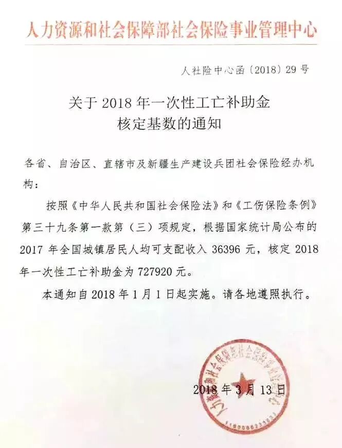重点 | 关于2018年一次性工亡补助金核定基数的通知