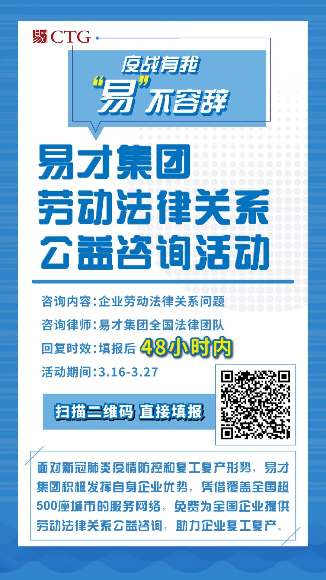 积极参与防疫工作是易才集团义不容辞的责任,为此,拥有专业律师团队的易才集团将针对复工复产过程中出现的劳动法律关系问题,向企业提供法律公益咨询服务,护航企业渡难关抗疫情,助推疫情依法防控。